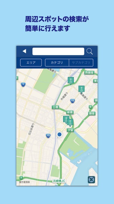 カテゴリごとに表示できますので、ニーズに合ったスポットが簡単に検索できます。
