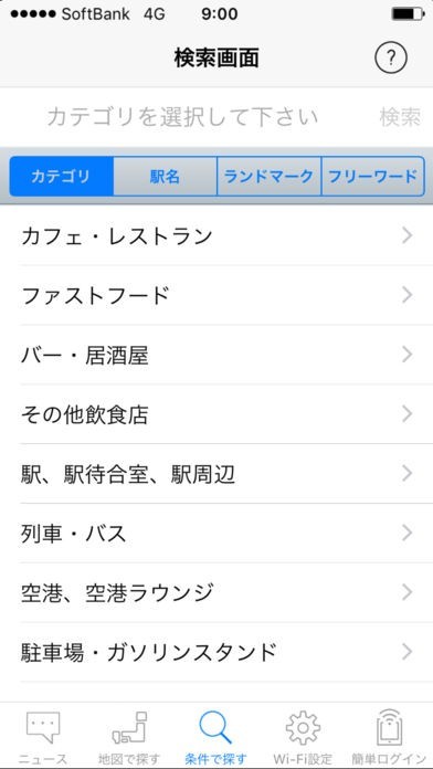 このアプリでIDとパスワードを設定しておくことによって2回目以降には素早くwifiを利用することが出来るようにしてくれます。 また、利用可能な箇所を「リスト」から地図上のピンで表示されるので、急に使用したい場合に近くの場所をすぐに発見してたどり着くことが出来るようになります。 また、「条件で探す」では、カテゴリからファストフード、列車・バスなどの中から選択することによって本当に利用したい理想の場所を把握することが出来ます。 他には、ニュースで新たなスポットに関する情報などを確認することが出来ます。