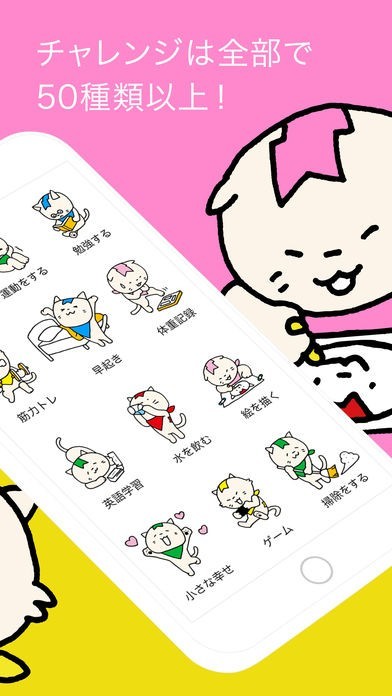 ダイエットのための糖質制限やジョギングなどを始めても数日もしたらやる気が起きなくなってしまう事はありませんか。そんな時『三日坊主防止アプリ-みんチャレ』なら同じ目的を持ったメンバーがあなたのやる気を刺激して励ましてくれます。ダイエット・勉強・トレーニングなど50のカテゴリーの中から目的と毎日~週1回の頻度を調節することで自分に合った難易度を設定することができるので気軽に始めることができます。また、チャットルームに目標を達成したと言う証拠写真を送ることで他のメンバーから褒めてもらえればやる気も維持できるというものです。目標を達成することによって自分だけでなくメンバーにもご褒美があり「にゃんチャレスタンプ」と交換できるコインをもらうことができるので他のメンバーのためにも、と頑張ることができます。