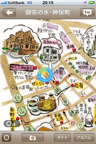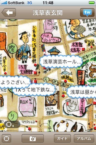Twitter(TW)ボタンを押すと、下町での最新のつぶやきが絵地図上に表示されます。「浅草寺に雪がつもっています!」「今、神保町でコーヒーを飲んでいます」など、ライブ感が絵地図の上に漂ってきます。(画像アップロード機能は次回更新にて対応予定です。)