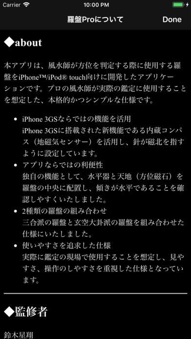 中国で研鑽を積み、風水の鑑定・研究に携わるプロの風水師が手がけるプロ仕様の本格風水アプリです。本格羅盤をアプリで簡単に開くことができ、風水師の活躍をサポートしてくれる便利アイテムです。
