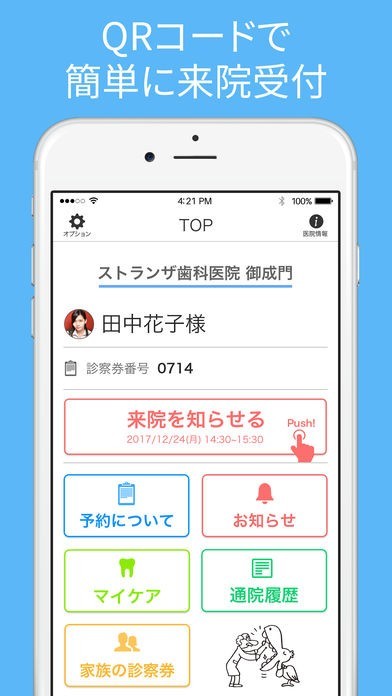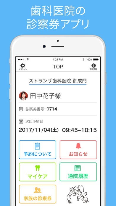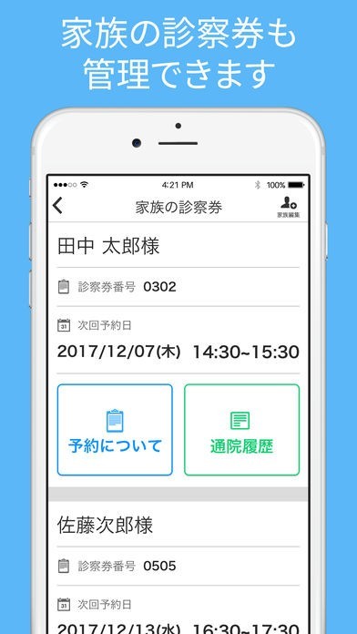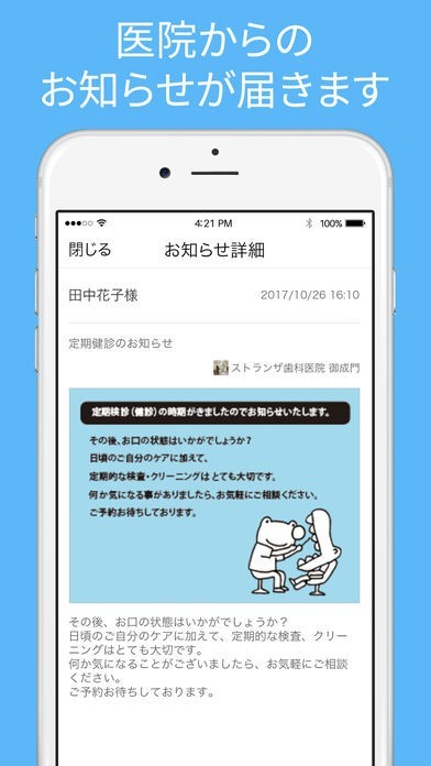 App Storeより引用アプリから直接予約が可能で、次回の予約や、過去の通院履歴も一目で見ることが出来ます。勿論、医院からのお知らせも、このアプリで受け取れます。本人だけでなく、お子様や高齢の方など付き添いの方でもお知らせを受け取ることができます。また、来院受付の機能やセルフケア商品のオススメ情報や購入履歴も一覧で確認できます。