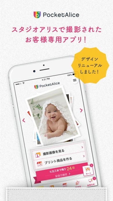 スタジオアリスで撮影した写真をアプリでいつでも見ることが出来る。焼き増しなどの注文もここから。