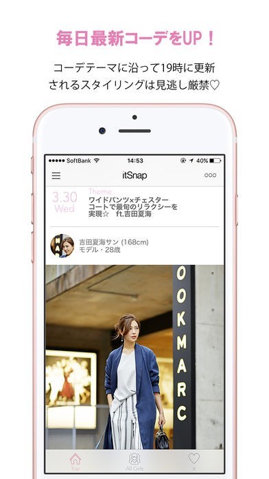 itSnapは20代前半から中盤の女性をメインターゲットに、10代後半からアラサー大人女子まで楽しめる"完全無料"のファッションアプリです。