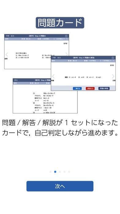 表示された問題の解答をノートに記入後、模範解答と解説を見ながらチェックが可能です。暗記に役立つ英単語や古文単語の一問一答テスト、数学や理科の分かにくいところを動画でチェックする素材集もあるので、勉学に励む学生に必須のアプリです。