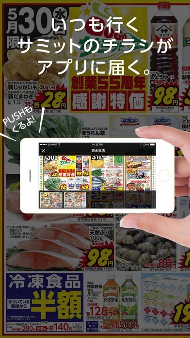 アプリ内で普段利用する店舗を登録すると、その店舗のチラシが閲覧できるようになります。また、新たにチラシが届いた際にはプッシュ通知でスマートフォンへとお知らせしてくれます。