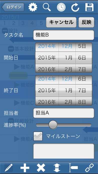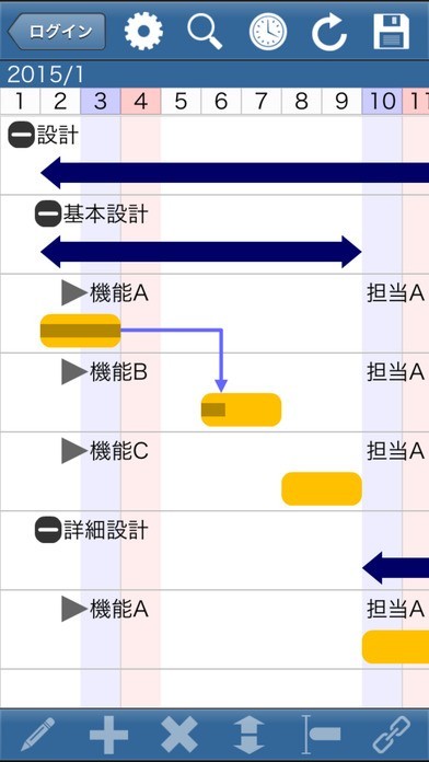 複数の人と一つのガントチャートを共有する事ができます。 作成したガントチャートは、パソコン上からも「みんなのガント.com」を通して共有する事ができるので、スマホやPCなどデバイスを問わず、プロジェクト管理やスケジュール管理ができるので効率よく作業を進める事が可能です。 シンプルなインターフェイスと、タップするだけの簡単な操作で閲覧や編集ができます。 編集の際には更新履歴によって、誰がいつ情報の更新をしたのかがわかるようになっています。 画面上でプロジェクトの進歩率の表示がされるので、メンバー全員でプロジェクトの進行状況を把握する事ができます。