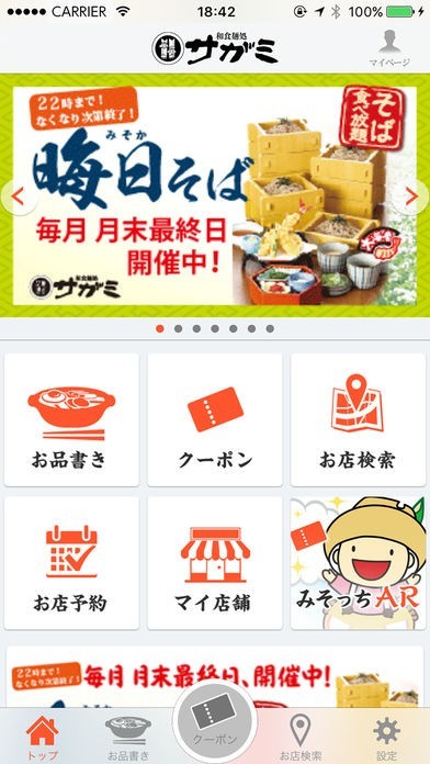 「サガミアプリ」は、同名のチェーン店で使用できる公式アプリです。グランドメニューはもちろん、期間限定のフェアや新メニューの情報が常に更新されています。公式キャラクターのみそっちが出すアンケートに答えれば、料理が安くなるクーポンをゲット。最寄りのお店を探したり、そのまま予約したりと、お店の利用を便利にする機能も満載です。