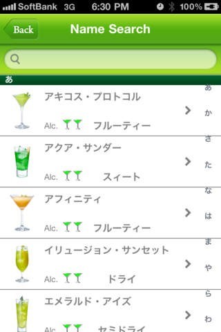 カクテル名、もしくは名前の一部からすばやく目的のカクテルを検索できます。