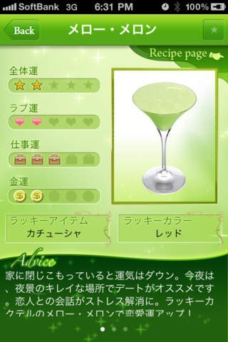 ラッキーカクテル、全体運、ラブ運、仕事運、マネー運、アドバイス、ラッキーカラー、ラッキーアイテムを占います。