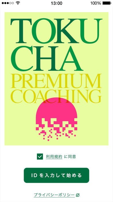 App Storeより引用特茶プログラム第二弾、特茶プレミアムコーチングを実施していただくためのアプリです。 受講者の方々は、お送りしているスターターキットに同梱されているIDを入力の上、プログラムを体験してください。
