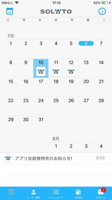「SOLATO CALENDAR」は、スマートフォンに太陽石油のガソリンスタンドからのお得なお知らせなどが届くアプリとなっていて、会員カードと連携させることができます。