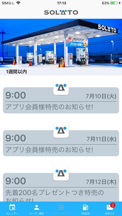 ダッシュボード機能を利用することによって、太陽石油のガソリンスタンドで開催される直近のイベント情報を一覧で表示することで確認することができるようになっています。