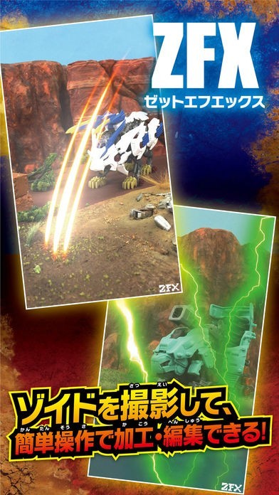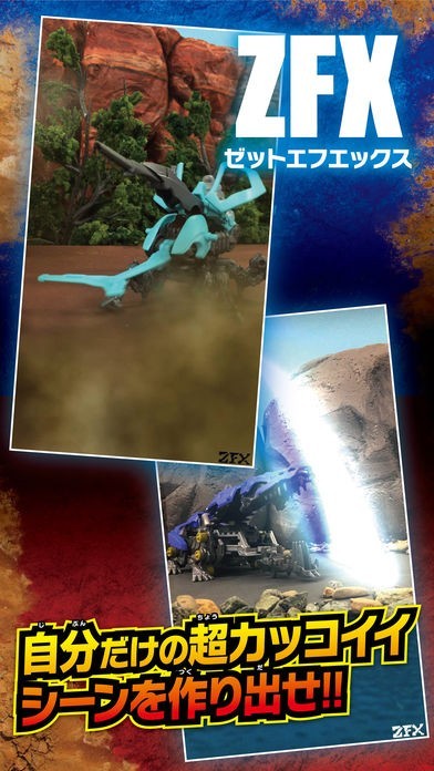 ゾイドワイルドは組み立てホビー・ゾイドをより楽しむアプリで、背景と炎やビームのエフェクトがつけられる写真撮影機能や、ゾイドワイルドの世界観を楽しめるシミュレーションゲームも用意されています。