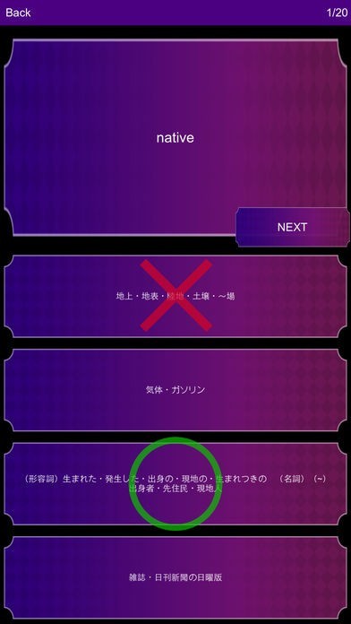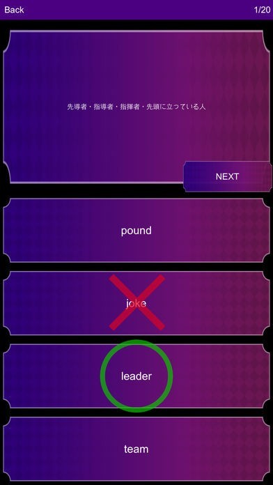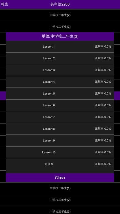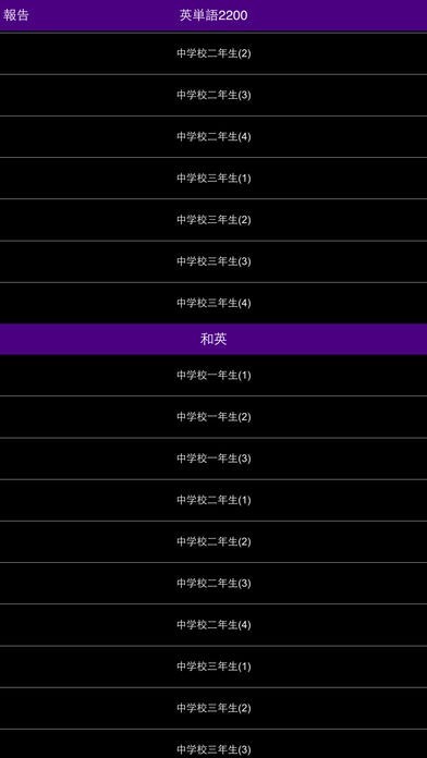 中学校で習う英単語と和英が2200問づつ収録されており、通学時間や空き時間を利用して気軽に中学英語の勉強が行なえます。問題は学年ごとに3つから4つに分割され、そこからさらに20問づつのLessonに分類されています。回答したLessonについては正解率が記録されるようになっているため、後から見直して苦手分野を復習することが出来ます。200問ごとには総復習問題が付いており、Lessonで勉強したことがどれだけ身についているかの確認が行なえます。中学生が予習復習のために利用するのはもちろんのこと、大人がクイズとして解いても楽しむことが出来ます。