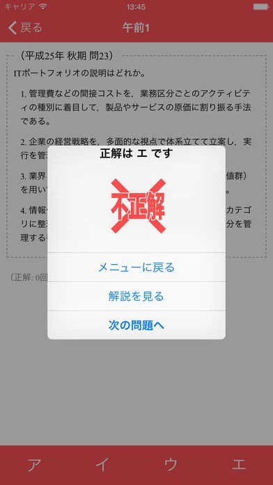 ・問題が表示されるので選択肢を選択します。正解または不正解のダイアログが表示され「メニューに戻る」「解説を見る」「次の問題へ」(最終問題の場合は、「結果を見る」)の選択肢があるので、選択します。
