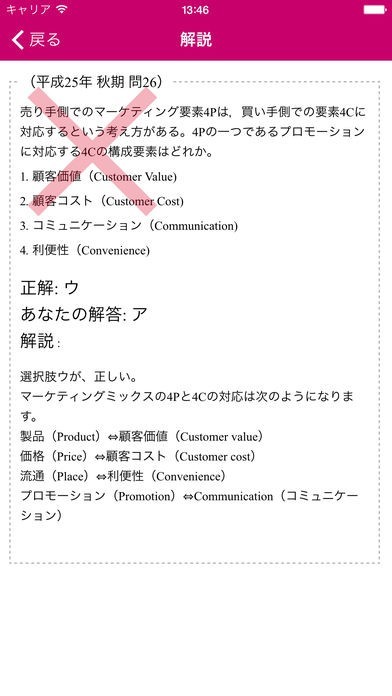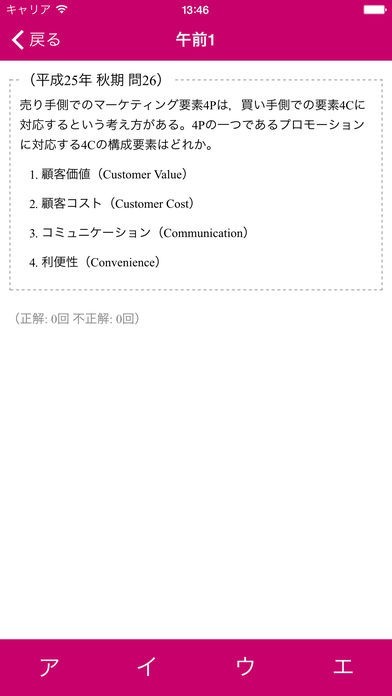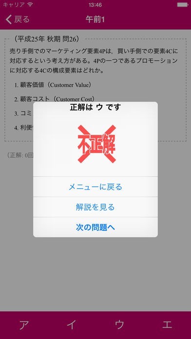 ・問題が表示されるので選択肢を選択します。正解または不正解のダイアログが表示され「メニューに戻る」「解説を見る」「次の問題へ」(最終問題の場合は、「結果を見る」)の選択肢があるので、選択します。