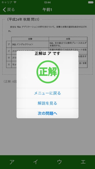 ・問題が表示されるので選択肢を選択します。正解または不正解のダイアログが表示され「メニューに戻る」「解説を見る」「次の問題へ」(最終問題の場合は、「結果を見る」)の選択肢があるので、選択します。
