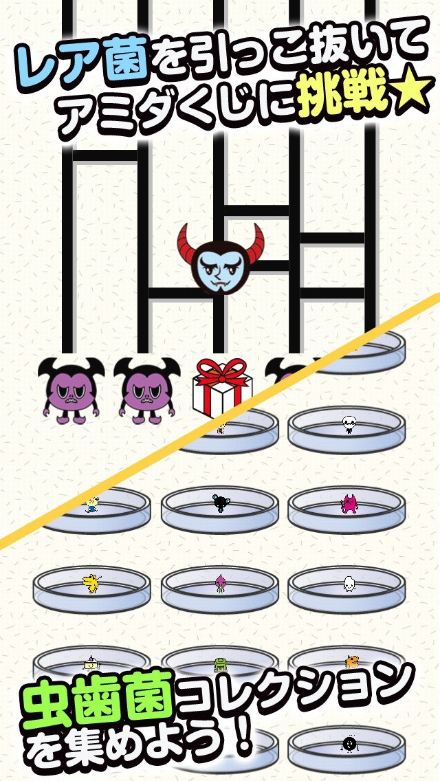 女の子の口の中に隠れている虫歯菌をひっこ抜いて歯の掃除を手伝ってあげるゲーム「歯みがき彼女」。口の中で顔を出した虫歯菌をスワイプすると除去できるのてすが、虫歯菌は案外しぶといので確実に抜けるまでしっかりスワイプしましょう。掃除を上手くやり続けられれば、女の子のかわいいイラストが報酬としてゲットできます。またレアな虫歯菌をひっこ抜くと挑戦できるあみだくじで当たりが出れば、虫歯菌コレクションを増やしていくこともできます。