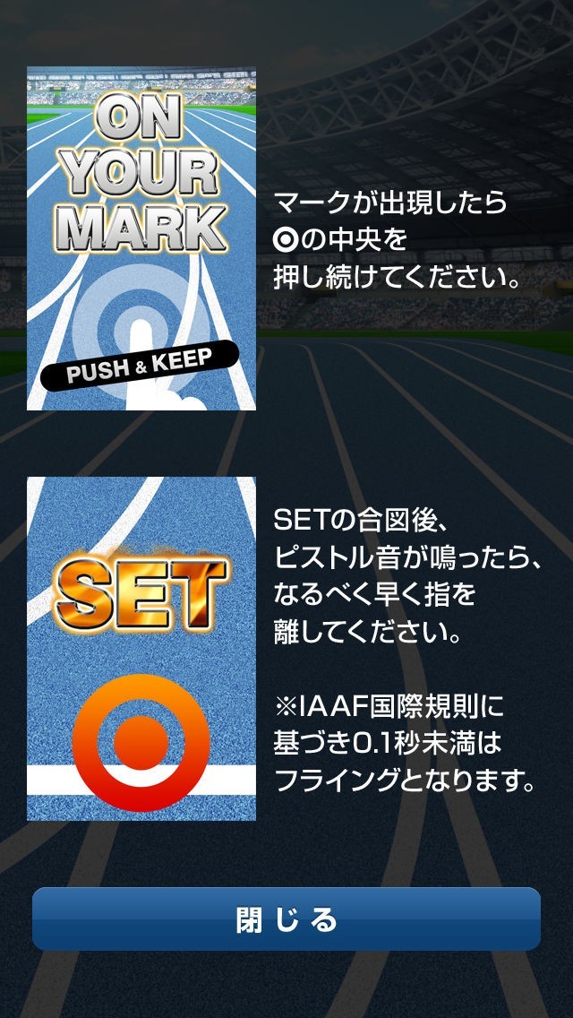 ピストル音以前に指を離すとフライング(不正スタート)となります。