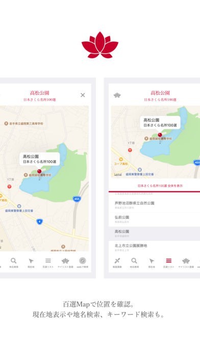 日本に存在する名所などの百選の場所を簡単に調べることができます。例えば百名山を選択すると百名山に選ばれた山の場所と山の名前が地図上に表示されます。今まで知らなかった百選に触れて知的好奇心を刺激しましょう。