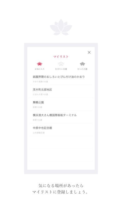 百選はお気に入りに登録することができます。マイリストはお気に入り・行った・行きたいの3種類が用意されているので、百選を簡単に管理して旅行の計画などに活用できます。