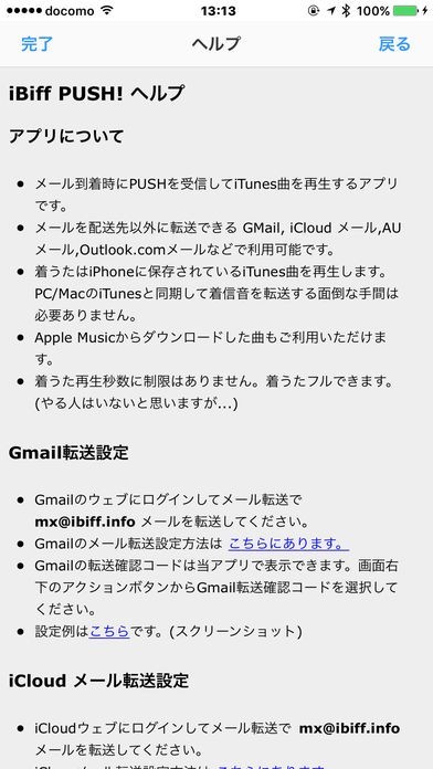メールを着信するとプッシュ通知を使用して、設定した曲をiTunesから呼び出して再生します。詳しい設定方法は、アプリ内のヘルプで確認できます。メール受信が少しだけ楽しくなるアプリです。