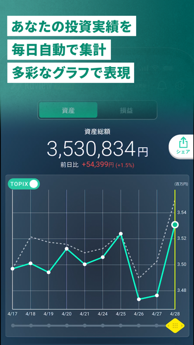 証券会社のサイトでは蓄積されない過去の資産増減やポートフォリオの変化を自動的に蓄積・グラフ化します。