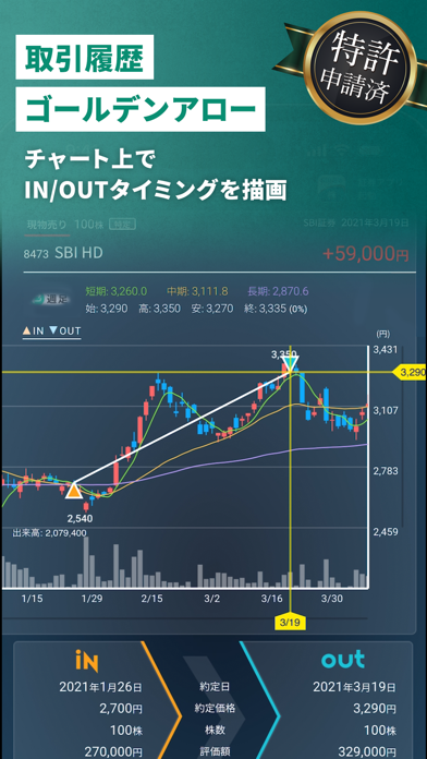 カビュウではチャート上にIN(購入)とOUT(売却)のポイントを描画する機能でINとOUTのタイミングや価格を可視化できます。