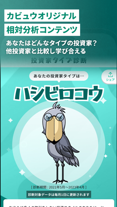 投資実績やポートフォリオなどのデータを元に診断を行い、投資家としての特徴を20種類以上のタイプに分類するカビュウオリジナルコンテンツです。