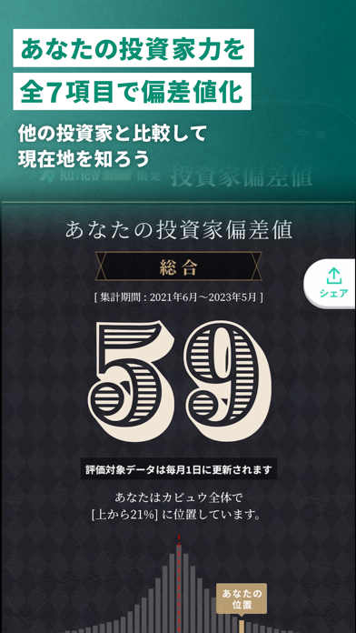 投資実績・運用成績やポートフォリオのデータをカビュウ全ユーザーと比較し、投資家力を全7項目で偏差値化したものです。