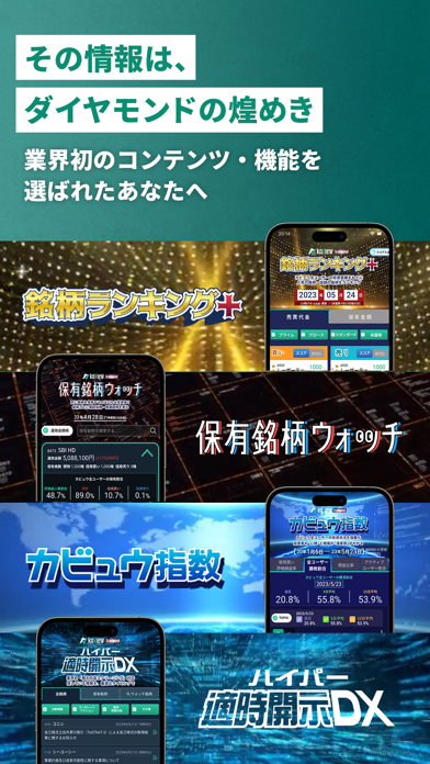 カビュウダイヤモンドにご登録いただくと、「保有銘柄ウォッチ」「銘柄ランキング+」「カビュウ指数」「ハイパー適時開示DX」の4つの新規コンテンツが無制限にご利用いただけます。また、登録口座数無限、毎日最優先でのデータ集計、2種類の限定壁紙など、カビュウのご利用をさらに便利にする機能をご提供いたします。