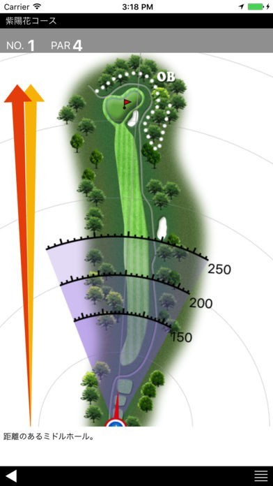 GPS機能を利用することによって、ゴルフホール上の自分の現在地をマップに表示することが可能となっているので、グリーンまでの距離や方角も一目でわかるようになっています。