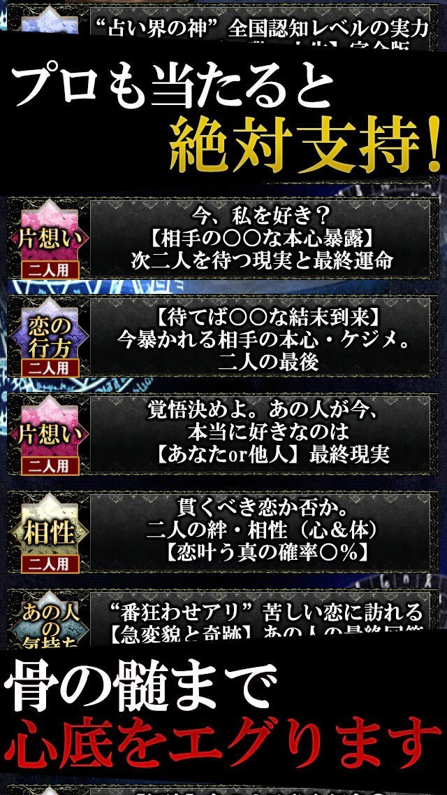 日本にタロット占いを広めたパイオニアともいわれている人気の占い師であるアレクサンドリア木星王氏による占いを受けることができるアプリが「20世紀NO.1占い≪冥王星占術≫アレクサンドリア木星王」です。40年以上の鑑定実績を持っているアレクサンドリア木星王氏だからこそ可能な、タロット占いを駆使した正確で役立つ占いを受けることが可能になっています。恋心の矛先や愛の末路などを鑑定することができる特別鑑定メニューが34種類用意されています。