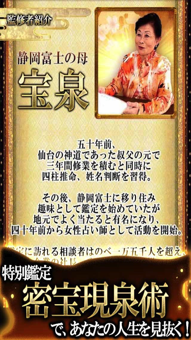 どんな運命でも本当の未来が知りたいと思っているなら、『静岡富士の母』宝泉監修の占いを試してみませんか?1万5千を超える人生を鑑定し、有名人・著名人もこぞって訪れる宝泉お墨付きのこのアプリは、人生でこれから起こる幸せも不幸せもすべて提示した上で、誰もが直面する不安・迷い・悩みに対して取るべき行動や進むべき道を教えてくれます。悔いを残さない人生を送るにはどうすればいいのか?考え抜いた決断を実行する時でも必ず不安が生まれてしまうのはなぜなのか?大事な最愛の人との関係はどう変わっていくのか?など、迷いなくベストを尽くして生きるために本当のことが知りたいという方にとって大きな力になる占いがいっぱいです。