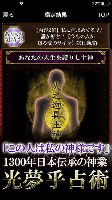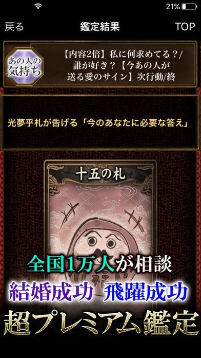 独自の占い方法である光夢乎カードを用いた、総合的な運勢を見る占術が利用できます。結果は占った日によって変わる場合があるので、長期的な占いとして活用することが可能です。