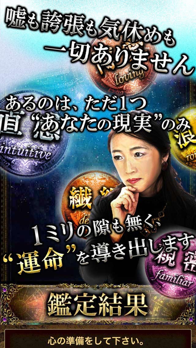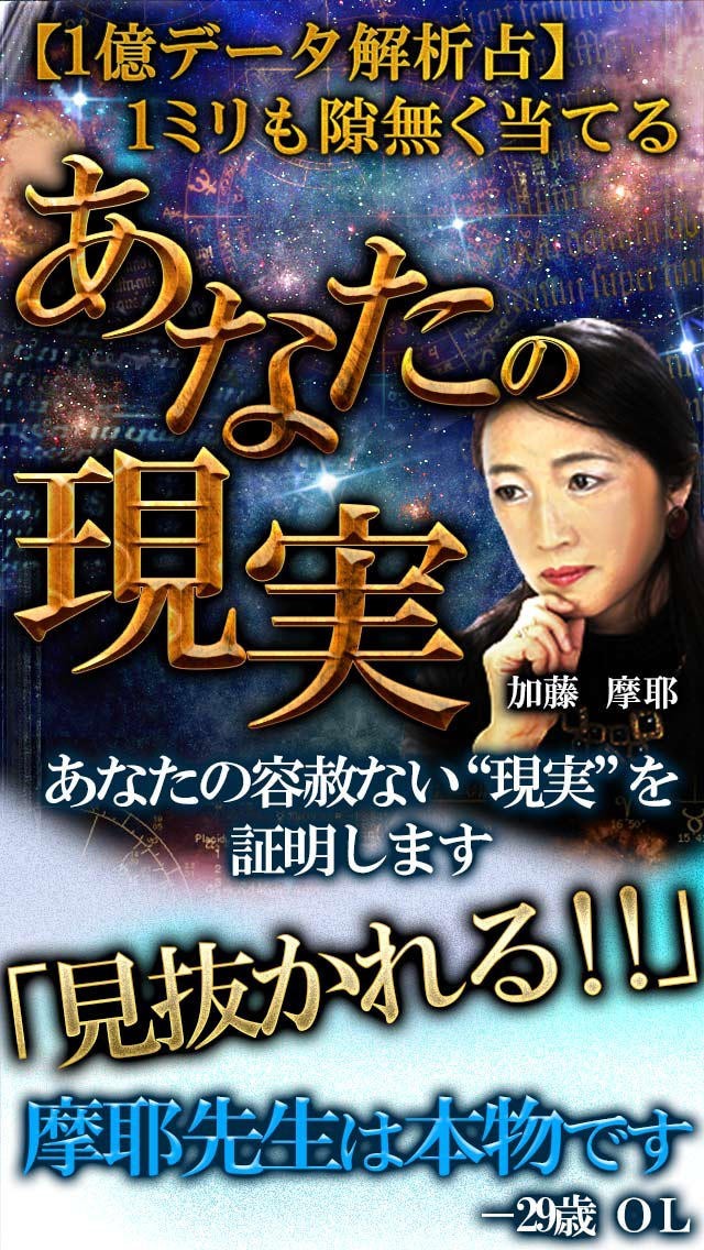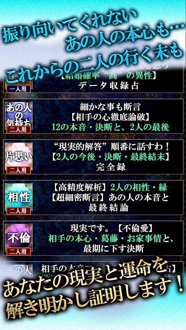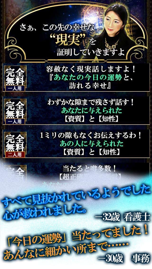 App Storeより引用鑑定実績1万人以上。30年にわたる1億データもの占い研究の成果から1ミリの予断も許さぬスーパー精度の分析力であなたの事を占います。わずかな運命の隙まで逃さず語る…当たるを100%に限りなく追及した「あなたの現実」をお聞きください。