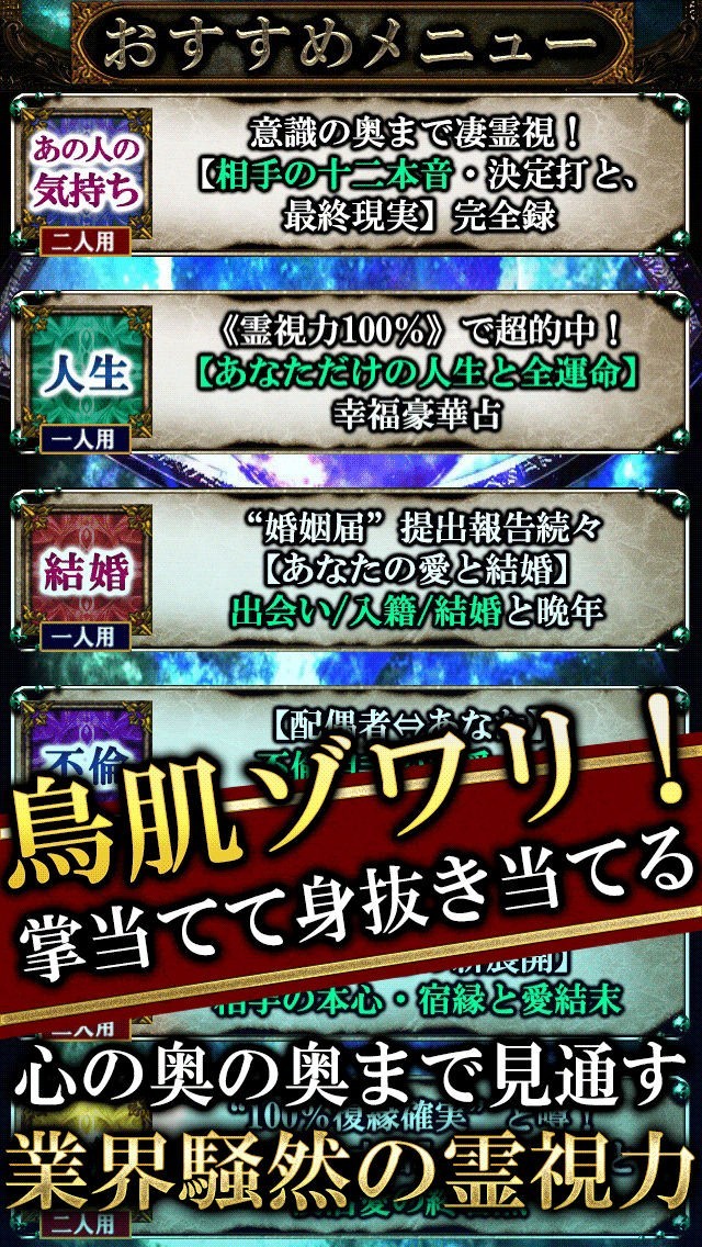 App Storeより引用あなたの心に手をかざし、核心を掴みます。100%当てると口コミ多数の的中霊視「気掌靈秘占」。驚異の霊視力で業界を騒然とさせた占いで口コミ多数!語らずとも手を当てただけで恐ろしい程見抜き、現実を当てるその的中力をお楽しみください。監修者は「森山なつ」。相談者の口コミだけで一気に人気が広がり一時は予約困難に。人気の占いが遂に登場です!
