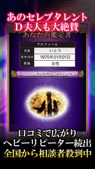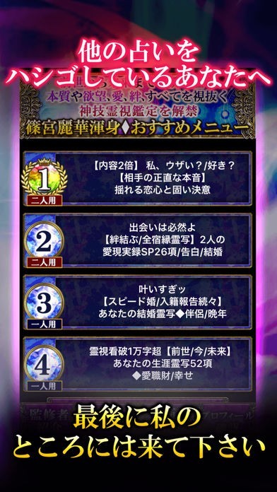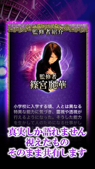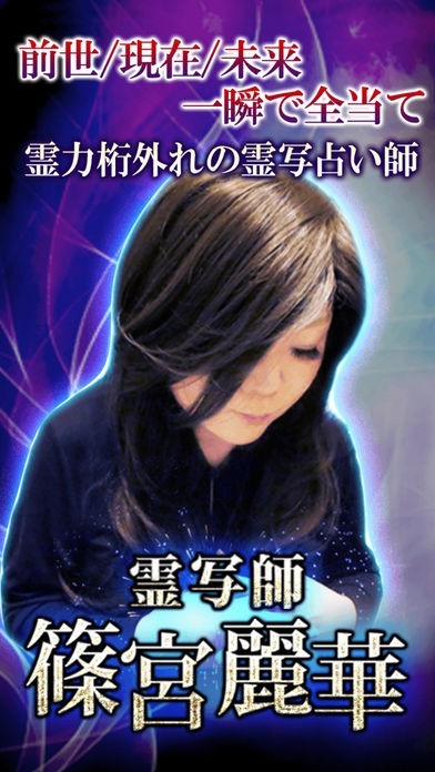 App Storeより引用『私のもとへは最後にいらっしゃってください』前世まで1秒で視抜き当てる圧巻の霊視力を誇る占い師が四国にいることをご存知でしょうか。【前世〜現在/未来】そのすべてを当てるといわれている「霊写師 篠宮麗華」彼女の圧巻の占いをあなたのお手元にてご体験ください。