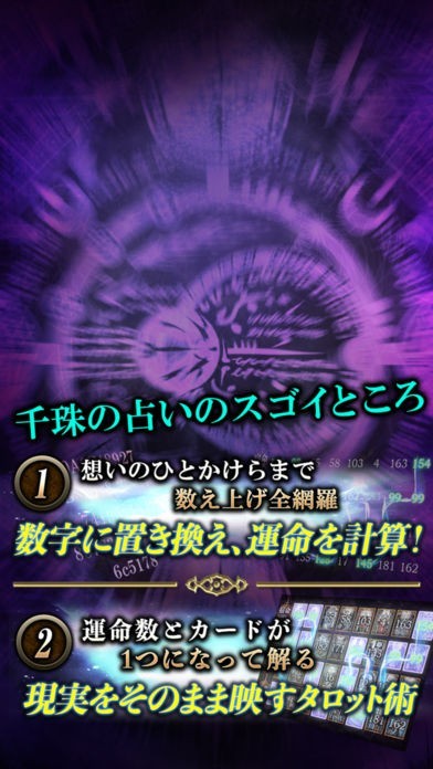 名古屋を拠点として活動している人気占い師・千珠。主にタロットを学び、自由自在にカードを操る様は「タロットの魔法使い」と噂されるほどです。これは、そんな彼女のタロット占いをスマホで手軽に体験できる占いアプリです。