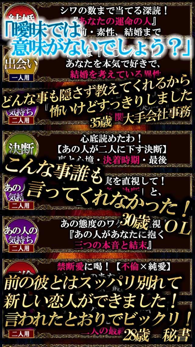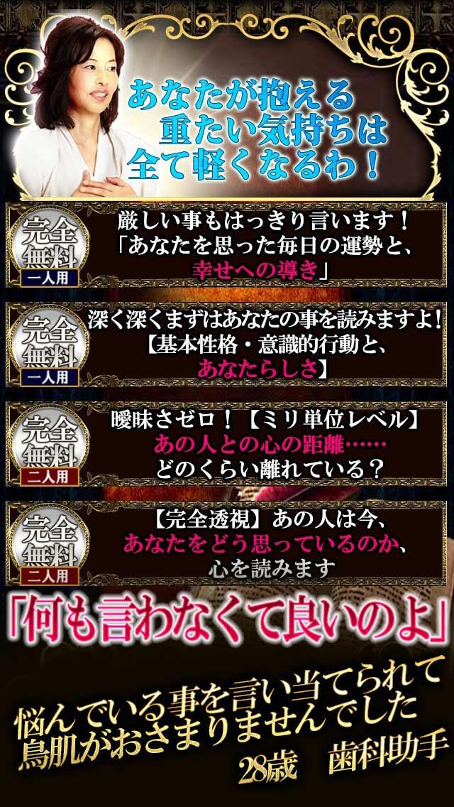 占いに時間はかけたくない人にオススメなアプリです。占いにかかる時間はわずか5秒!これなら、時と場合を選ばず占えるので、毎日使いたくなるでしょう。占いの内容は、恋愛、本音、仕事、お金、結婚etc。一通りのジャンルは網羅しています。したがって、学生、OL、主婦などユーザーを選びません。その内容は、必ずしも女性向けとは限らないので、男性も使える占いアプリを探しているメンズにも役立ってくれるでしょう。ちなみに、本アプリをプロデュースしているのは、心読みヒーラーの優希先生です。多くの相談者を解決に導いてきた指折りの占い師ですから、「有名占い師に相談してみたかった」と言う人も、これを機にチャレンジしてみてください。