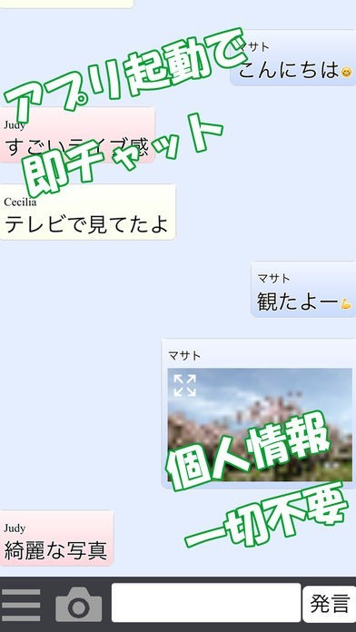 SNSに参加していない友達と、ちょっとだけチャットがしたい! 誰かと今すぐ話がしたい! そんな時にはチャットアプリ「チャットチャンネル」が便利です。 必要なのはニックネームだけ。アカウント登録を行わずにすぐにチャットが始められるので、今すぐ話したという時にも活用することができるでしょう。 チャットルームには複数人が入室可能な他、写真の投稿も可能。 すべての記録はメンバーが退室すると削除されるため、秘密の話も安心してすることができちゃいます!