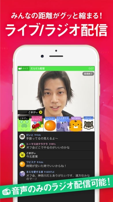 アプリから配信できます!コアファンがとても楽しみに待っているライブ配信で、みんなとの距離をグッっと縮めましょう。音声のみのラジオモードも可能です!