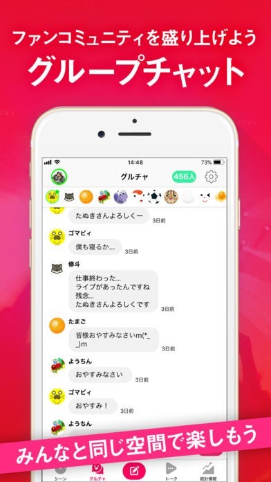 大勢のコアファンと一気にコミュニケーションが取れるグルチャで、あなたの事が大好きなみんなと楽しくわいわい盛り上がりましょう!