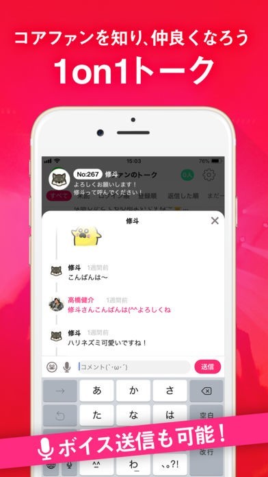 コアファンと1:1でトークできる!友達の様におしゃべり出来たり、コアファンがあなたについて普段気になっていたことを気軽に聞いたりしながら、コアファンと仲良くなりましょう!