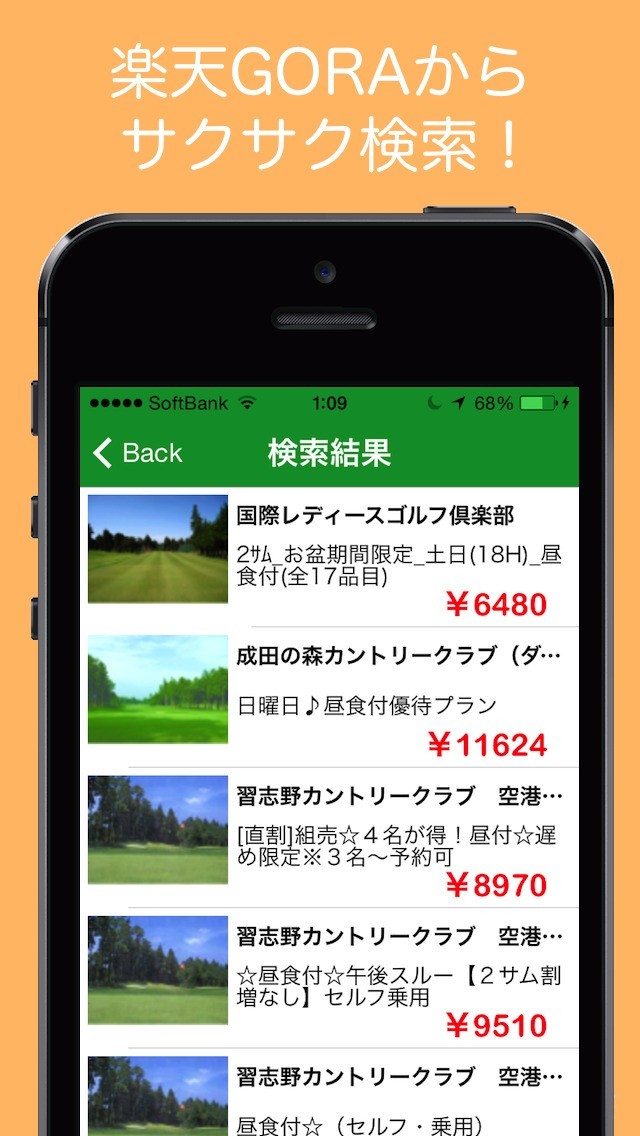 「ゴルフ予約 for 楽天GORA」は楽天GORAのリアルタイムデータを取得しています。本家の楽天GORAと同じ情報量のゴルフプランから検索することができます!