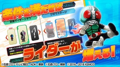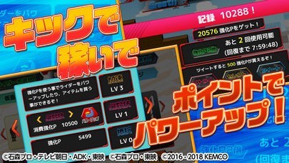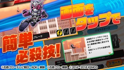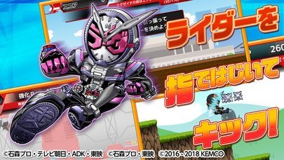 画面を走る仮面ライダーをタップすることでライダーキックを放ち敵を打ち倒そう。ライダーによって性能差あり。