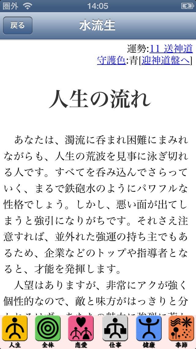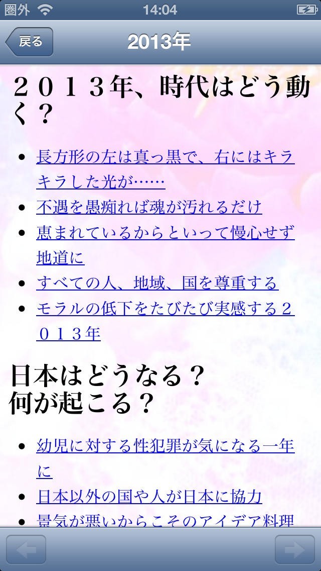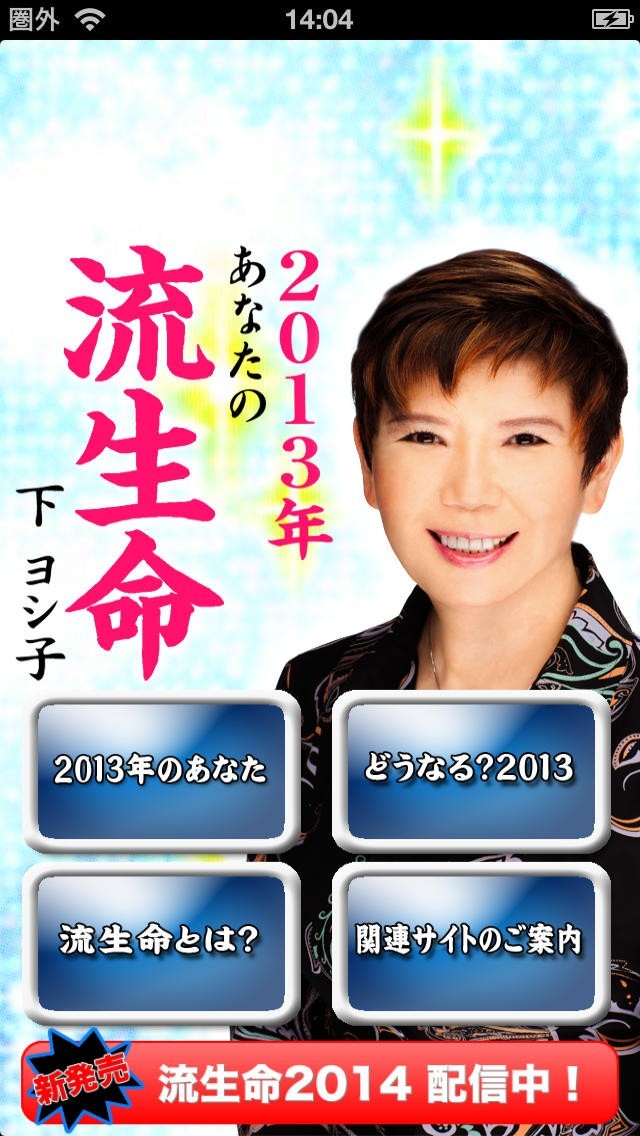 下ヨシ子の「2013年 あなたの流生命」 は、下ヨシ子さんが、あなたの運勢を導いてくれるアプリです。下ヨシ子さんは、スーパー霊能力者として様々なメディアで活躍している人物。依頼者多数 なので、予約が取れないことで有名なのですが、そんな人物の占いがアプリで使えるのは嬉しい概要です。あなたの性別と誕生日をもとに、10通りに分けた「流生命」を導いてくれます。その内容は「人生の流れ」「恋愛運・結婚運・家庭運」「結婚」「季節別の運勢」etc。これらにプラスして、今後の日本がどう動くのか?も導いてくれるのが 面白いところです。