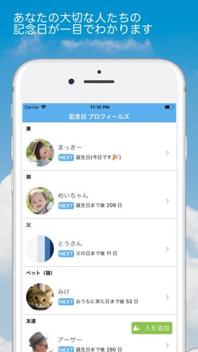次にやって来る記念日もあと何日表示でプロフィール一覧から簡単に把握することもできます。