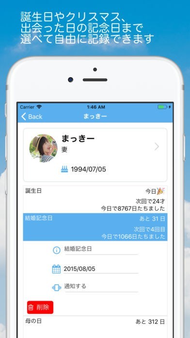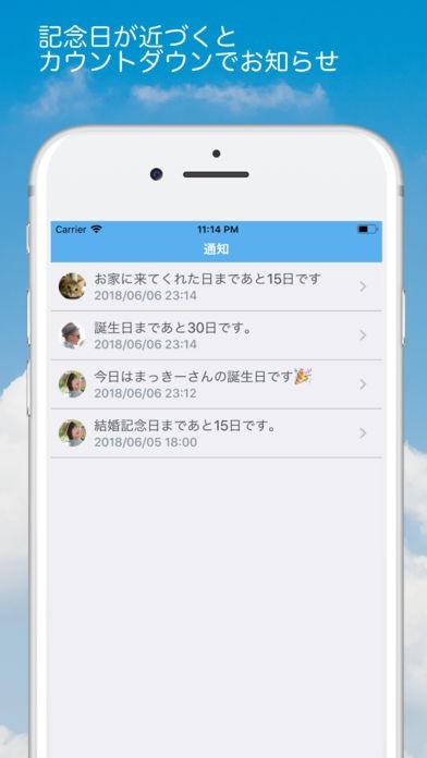 大切な記念日を30日前、15日前、7日前、前日、当日とカウントダウンして通知でリマインド。